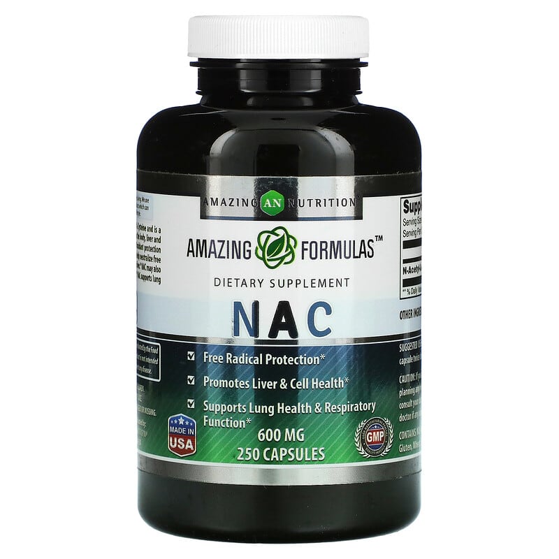 Amazing Formulas™Dietary SupplementFree Radical ProtectionPromotes Liver & Cell HealthSupports Lung Health & Respiratory FunctionGMP – Good Manufacturing PracticeWe believe that Amazing Nutrition® is the key for Healthy Living. We are passionate about bringing you the finest selection of products which can perfectly complement a healthy diet and active lifestyle.N-acetyl-L-Cysteine (NAC) comes from the amino acid L-Cysteine and is a precursor to the antioxidant Glutathione. NAC provides the body, liver and cells with increased levels of Glutathione and the antioxidant protection they need to better perform their functions. NAC may help neutralize free radicals, enhance the immune system and detoxify the liver. NAC may also help delay muscle fatigue and support muscle growth. NAC supports lung health and healthy respiratory function.