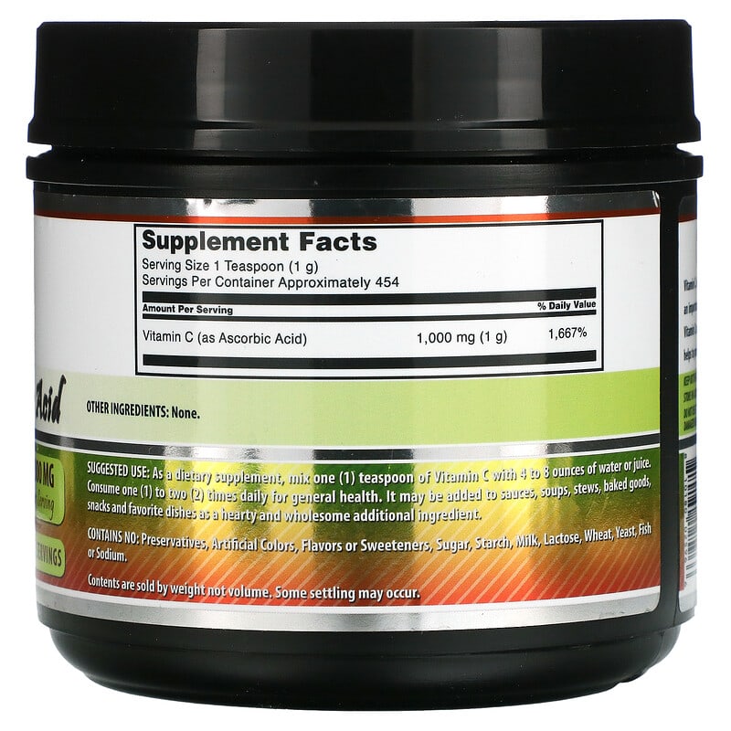 As a dietary supplement, mix one (1) teaspoon of Vitamin C with 4 to 8 ounces of water or juice. Consume one (1) to two (2) times daily for general health. It may be added to sauces, soups, stews, baked goods, snacks and favorite dishes as a hearty and wholesome additional ingredient.