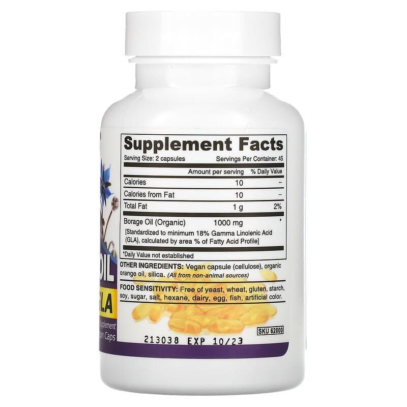 Dietary Supplement100% Vegetarian, VeganThe Borage Oil used in this product is: Organic, Cold-pressedVegan® – This product does not contain animal products, derivatives or byproducts. 100% Vegetarian, Vegan. This product is registered with the Vegan Society.