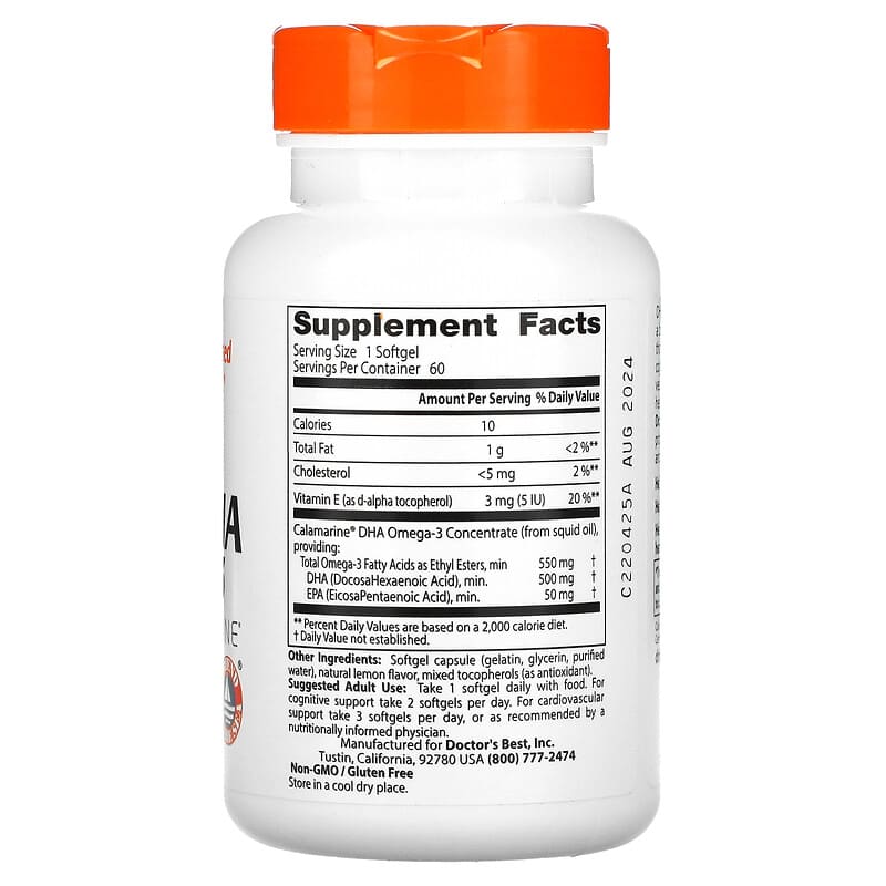 Science-Based Nutrition™ Helps Support Brain and Cardiovascular HealthFriend of the Sea®️ Dietary SupplementNon-GMO/Gluten FreeDHA (DocosaHexaenoic Acid, Omega-3) is a building block for the cell membranes that manage many vital processes, such as cognitive performance, heart and blood vessel health, vision, immunity, wound healing, and all major organ functions. Doctor’s Best Calamari DHA Omega-3 is produced from sustainably harvested squid, and molecularly distilled to ensure purity.Helps support cell, tissue and organ functionsHelps support cognitive performanceHelps support cardiovascular and overall health at life stages