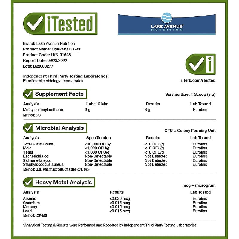 Lake Avenue Nutrition OptiMSM® Featuring Methylsulfonylmethane (MSM)Supports Connective Tissue and Joint Health* Suitable for Vegetarians and VegansFormulated without Gluten, GMOs, or SoyProduced in a GMP Facility