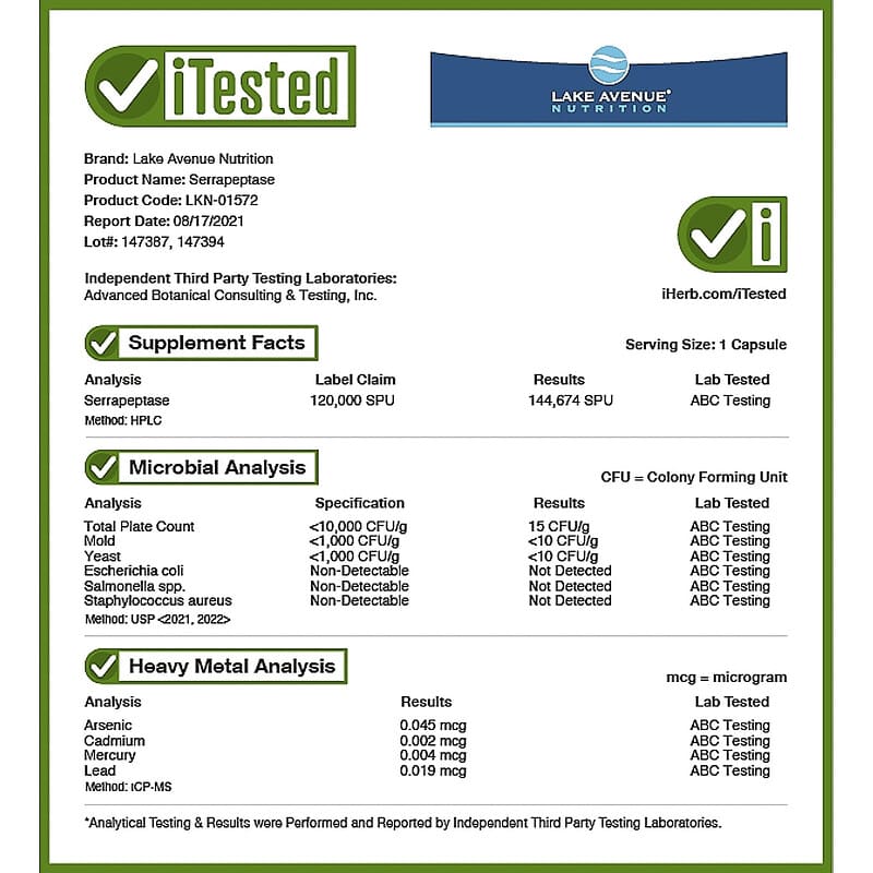 Lake Avenue Nutrition Serrapeptase, 180 Veggie CapsulesProteolytic Enzyme, 120,000 SPUs (Serratiopeptidase Units)Supports Healthy Sinuses and Immune Function*Suitable for Vegetarians Formulated without Gluten or GMOsProduced in a GMP Facility