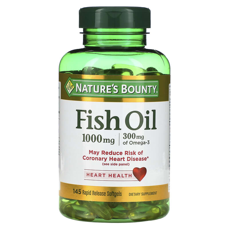 300 mg of Omega-3May Reduce Risk of Coronary Heart Disease*Dietary SupplementHeart HealthCholesterol FreePurified to Eliminate MercuryGuaranteed QualityLaboratory TestedPure-Catch™Sodium FreeNearly 50 Years of Trusted QualityAt Nature’s Bounty, we are committed to your health. For nearly 50 years we have been making trusted products, backed by science, and made with only the purest ingredients..guaranteed. So you can get the most out of life every day.*Supportive but not conclusive research shows that consumption of EPA and DHA Omega-3 fatty acids may reduce the risk of coronary heart disease. See nutrition information for total fat and cholesterol content. One serving of Fish Oil provides 300 mg total of EPA, DHA and other omega-3 fatty acids.