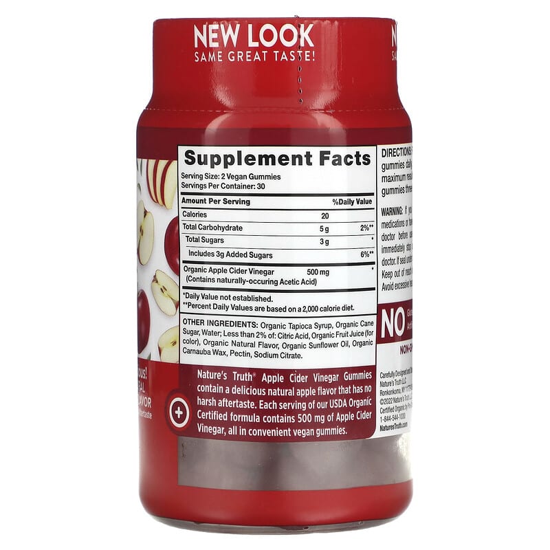 100% Quality – Satisfaction GuaranteedVitaminsUSDA OrganicGluten FreeNon GMODelicious!No Vinegar AftertasteDietary SupplementVegan FormulaNature’s Truth Apple Cider Vinegar Gummies contain a delicious natural apple flavor that has no harsh aftertaste. Each serving of our USDA Organic Certified formula contains 500 mg of Apple Cider Vinegar, all in convenient vegan gummies.