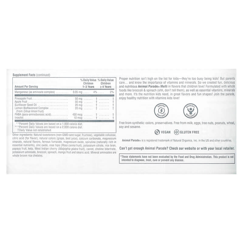 With Other Natural FlavorsVeganGluten Free Proper nutrition isn’t high on the list for kids-they’re too busy being kids! But parents care… and know the importance of vitamins and minerals. So we created fun, delicious and nutritious Animal Parade® Multi in flavors that children love! Formulated with whole foods like broccoli & spinach (shh, don’t tell them), as well as essential vitamins, minerals and more. It’s the nutrition kids need, in great flavors and fun shapes! Join the parade, enjoy healthy nutrition with vitamins kids love!
