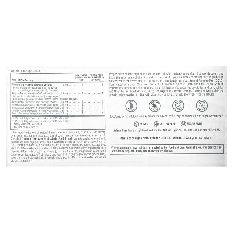Vitamin D3, K2 & ProbioticsChildren’s Chewable SupplementSugar Free AssortedWith Other Natural FlavorsVeganGluten FreeBone SupportDigestive SupportImmune SupportEnergy SupportProper nutrition isn’t high on the list for kids – they’re too busy being kids! But parents care… and know the importance of vitamins and minerals. And if your children are striving for the gold, then why not reach for it? We created fun, delicious but uniquely nutritious Animal Parade® Multi GOLD! Formulated with over 20 whole foods like broccoli & spinach (shh, don’t tell them), with all important vitamins, the key minerals, essential fatty acids, enzymes, probiotics and beyond! It’s MORE of the nutrition kids need, in 3 great Sugar Free flavors: Orange, Cherry and Grape. Join the parade, enjoy healthy nutrition with vitamins kids love, and help them reach for the GOLD!Sweetened with xylitol, which may reduce the risk of tooth decay, as compared with sugar sweeteners.