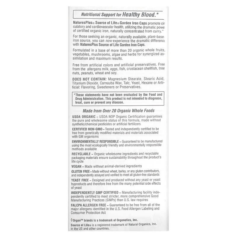 Certified Non-GMOWhole Food GrownGluten Free USDA OrganicDietary SupplementCertified Organic by EcoCert ICONutritional Support for Healthy Blood.NaturesPlus® Source of Life® Garden Iron Caps promote circulatory and cardiovascular health, utilizing the dramatic power of certified organic iron, naturally concentrated from curry.For those seeking an organic, naturally available, plant-based iron source, you can now experience the dramatic difference with NaturesPlus Source of Life Garden Iron Caps.Formulated in a base of more than 20 organic whole fruits, vegetables, mushrooms, algae and herbs for synergized assimilation and maximum results.Made from 20 Organic Whole FoodsUSDA Organic USDA NOP Organic Certification guarantees the pure and wholesome status of this formula, made without synthetic/chemical pesticides and artificial fertilizersCertified Non-GMOTested and independently certified to be free from genetically modified materials and materials associated with GM organismsEnvironmentally ResponsibleGuaranteed to be manufactured using the most ecologically friendly environmentally responsible methods availableRecyclable Organic wholesome ingredients and recyclable packaging material ensure sustainability throughout the product’s life cycleVeganMade without animal-derived ingredientsGluten FreeMade without wheat, barley, or any gluten contributors, and independently assayed and verified to meet all gluten-free standardsYeast FreeDesigned and produced without any yeast or yeast byproducts and therefore free from the many potential side effects of yeastIndependently GMP CertifiedManufacturing facility independently certified to meet stricter Good Manufacturing Practices (GMPs) than U.S. law requiresFALCPA Allergen FreeGuaranteed to be free from all of the major allergens identified in the U.S. Food Allergen Labeling and Consumer Protection Act