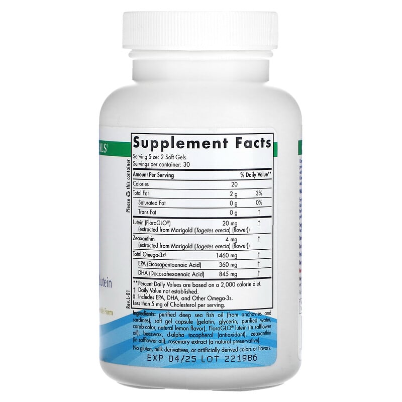 Purified deep sea fish oil (from anchovies and sardines), soft gel capsule (gelatin, glycerin, purified water, carob color, natural lemon flavor), FloraGLO® lutein (in safflower oil), beeswax, d-alpha tocopherol (antioxidant), zeaxanthin (in safflower oil), rosemary extract (a natural preservative).No gluten, milk derivatives, or artificially derived colors or flavors.
