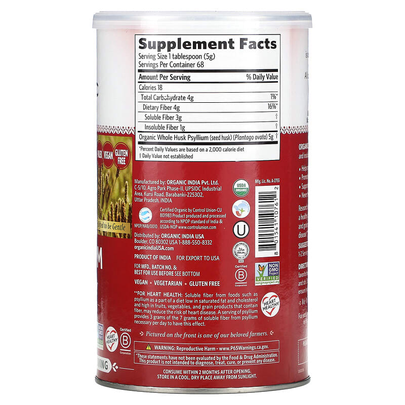 Keto Paleo VeganGluten Free Triple Sifted to be Gentle Dietary SupplementUSDA OrganicNon GMO Project VerifiedHeart Healthy Certified B CorporationHealthy Conscious Living Certified Organic by Control UnionKosher Halal VegetarianWe Wish You a Life of Good Health and HappinessAt The Heart Of Organic India is our commitment to be a living embodiment of love and consciousness in action. All our products promote health and happiness and are made with loving care.Ethical, Authentic, Reliable, Trustworthy, Holistic Socially, Environmentally, Economically ResponsibleOrganic India Psyllium is an excellent source of both soluble and insoluble natural dietary fiber.Helps maintain healthy elimination and regularityPromotes appetite controlSupports the entire gastrointestinal systemNever treated with toxic pesticides or chemicalsResearch shows that the soluble fiber from PSYLLIUM, along with a healthy diet low in saturated fat and high in fruits, vegetables, and grain products that contain fiber, may reduce the risk of heart disease****For Heart Health: Soluble fiber from foods such as psyllium as a part of a diet low in saturated fat and cholesterol and high in fruits, vegetables, and grain products that contain fiber, may reduce the risk of heart disease. A serving of psyllium