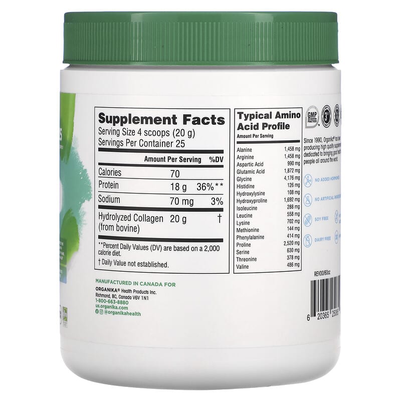 25 Day SupplyDietary Supplement100% Flavorless Hydrolyzed Collagen (Peptides) Powder20 g or Collagen Per Serving18 g of Protein Per ServingGrass FedPromotes the Growth of Healthy Hair, Skin & NailsAntibiotic FreeKeto FriendlyIgen – Non-GMO TestedScoop IncludedGMP Good Manufacturing PracticesThird Party TestedGluten FreeNo BPANo Added HormonesNo Artificial IngredientsSoy FreeDairy FreeNo Sugar AddedEnhance your glow from the inside out! Organika®’s Enhanced Collagen™ packs 18 grams of protein per serving, supporting the growth and recovery of lean muscle mass and joints while building stronger hair, skin, and nails. Bringing out your inner youth is easier than ever: Enhanced Collagen™ can be easily mixed into your morning coffee, smoothies, baking or cooking.Since 1990, Organika® has been producing high quality supplements dedicated to bringing good health to people all around the world.