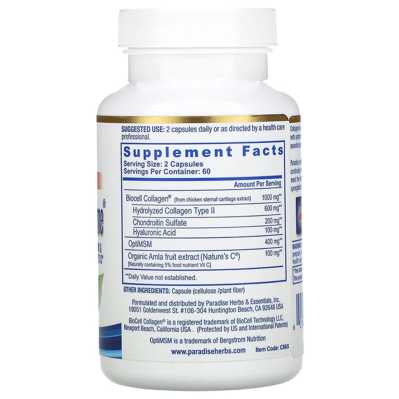 Thành phần của Paradise Herbs Collagen Extreme with BioCell Collagen OptiMSM & Nature’s C 120 Capsules