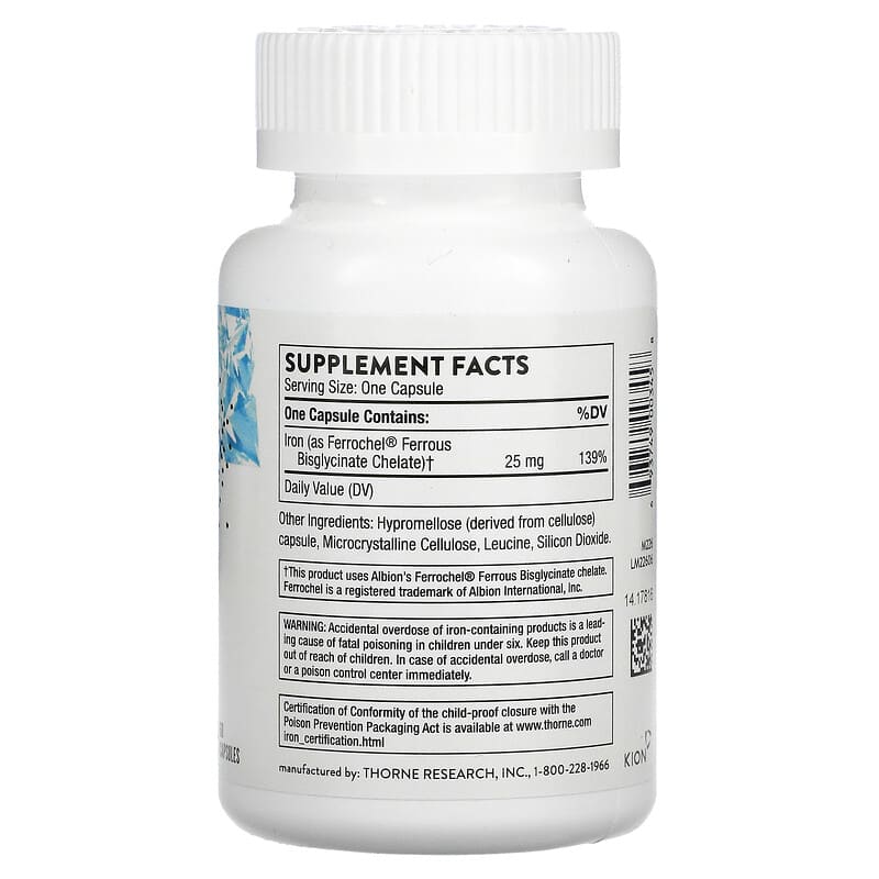 Dietary SupplementFoundationalBlood BuilderNSF Certified for SportGluten FreeIron in a form for enhanced absorption without gastrointestinal side effects.Iron Bisglycinate provides an optimal way to supplement iron, which is essential for red blood cell formation. It helps fight fatigue and other symptoms of iron deficiency in athletes and others. NSF Certified for Sport.Thorne’s Iron Bisglycinate is NSF Certified for Sport. It is essential for the formation of red blood cells. The U.S. Centers for Disease Control has determined that the prevalence of iron deficiency is greatest among toddlers (7% of those ages 1-2 years) and menstruating adolescent and adult females (9-16 % of individuals ages 12-49, whether they are athletes or not. Conventional iron supplementation, including forms such as ferrous sulfate, can cause gastrointestinal side effects – including nausea, vomiting, constipation, diarrhea, and dark-colored stools – because these conventional forms of iron are poorly absorbed. Thorne’s Iron Bisglycinate provides 25 mg of elemental iron per capsule that has been reacted with glycine for optimal absorption in the gastrointestinal tract, thus helping to decrease the typical gastrointestinal side effects.An iron deficiency can manifest as weakness, fatigue, shortness of breath on exertion, dizziness, tinnitus, spots before the eyes, drowsiness, irritability, infrequent menstruation, and loss of libido. Athletes need approximately 1.5 times as much Iron as non-athletes. Those who follow a vegetarian or lower protein diets may have needs as high as 1.8 times as much dietary iron. Blood loss from injury and muscle damage, as well as GI bleeding associated with extreme endurance activities can further decrease the body’s iron stores.Low iron can lead to a reduction in the body’s normal uptake of oxygen to cells. A reduction of oxygen to cells can lead to a reduction in work capacity and aerobic performance. Untreated chronic low levels of iron can lead to iron deficient anemia.Because an athlete needs to know that his or her supplements are trustworthy and compliant, every batch of an NSF Certified for Sport product is tested for compliance with label claims and to ensure the absence of more than 200 substances banned by many major athletic organizations, including stimulants, narcotics, steroids, diuretics, beta-2 agents, and masking agents.