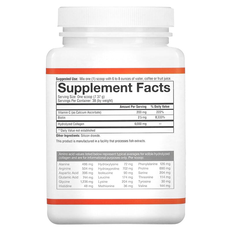 | Amino acid values listed below represent typical averages for edible hydrolyzed collagen and are for informational purposes only. Per scoop: | |||||
