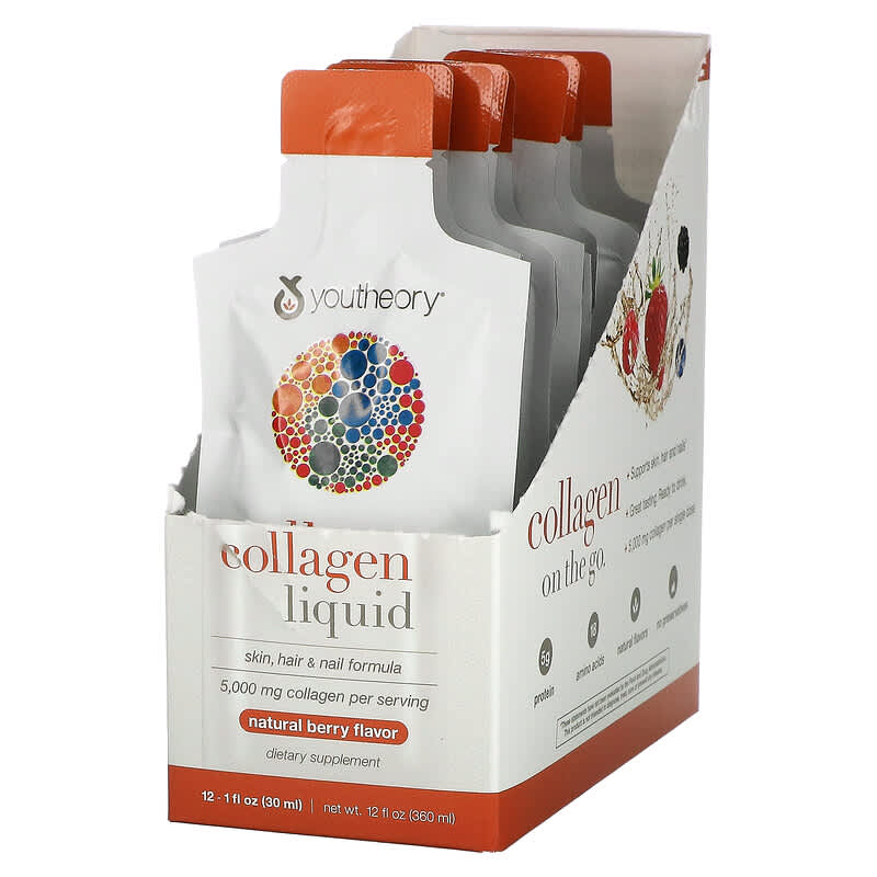 Skin, Hair & Nail FormulaDietary SupplementGreat Tasting. Ready to Drink.Supports Skin, Hair and Nails5,000 mg Collagen Per Single Dose5 g Protein18 Amino AcidsNatural FlavorsNo PreservativesReplenishes Beauty ProteinsReduces Fine Lines & Wrinkles‡Pretty TastyCollagen is the most abundant protein in the body and helps give structure to your skin, hair and nails. As you get older, your body’s natural ability to produce collagen will decrease over time – leading to visible signs of aging.Youtheory® Collagen Liquid is designed to help counteract age-related collagen loss. With 5,000 mg of uniquely soluble and highly absorbable collagen peptides, this great-tasting liquid formula provides the building blocks to support healthy aging and a more youthful appearance. Use daily for optimal results.‡Clinical studies have shown that 2,500 mg of Verisol® Collagen Peptides per day may help reduce the appearance and depth of wrinkles, while also improving skin appearance of cellulite and increasing skin elasticity.